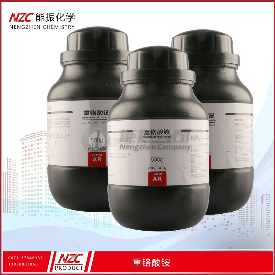 - 氧化剂:重铬酸铵是一种强氧化剂,可用于生产铬酸、铬盐、铬合金等。例如,将重铬酸铵与二氧化碳反应可制备铬酸,铬酸是生产各种铬盐的重要原料。
